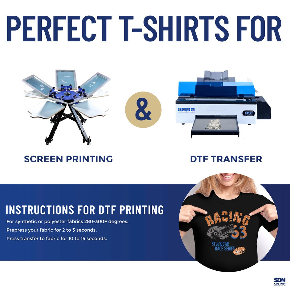 "Get ready for comfort and style with our Adult T-Shirts in black Made with a super soft blend of 95% polyester and 5% spandex, these shirts provide a comfortable and flattering fit for all body types. Perfect for DTF and screen printing, these t-shirts are a great choice for creating personalized designs or branding. Available in a 5 pack,